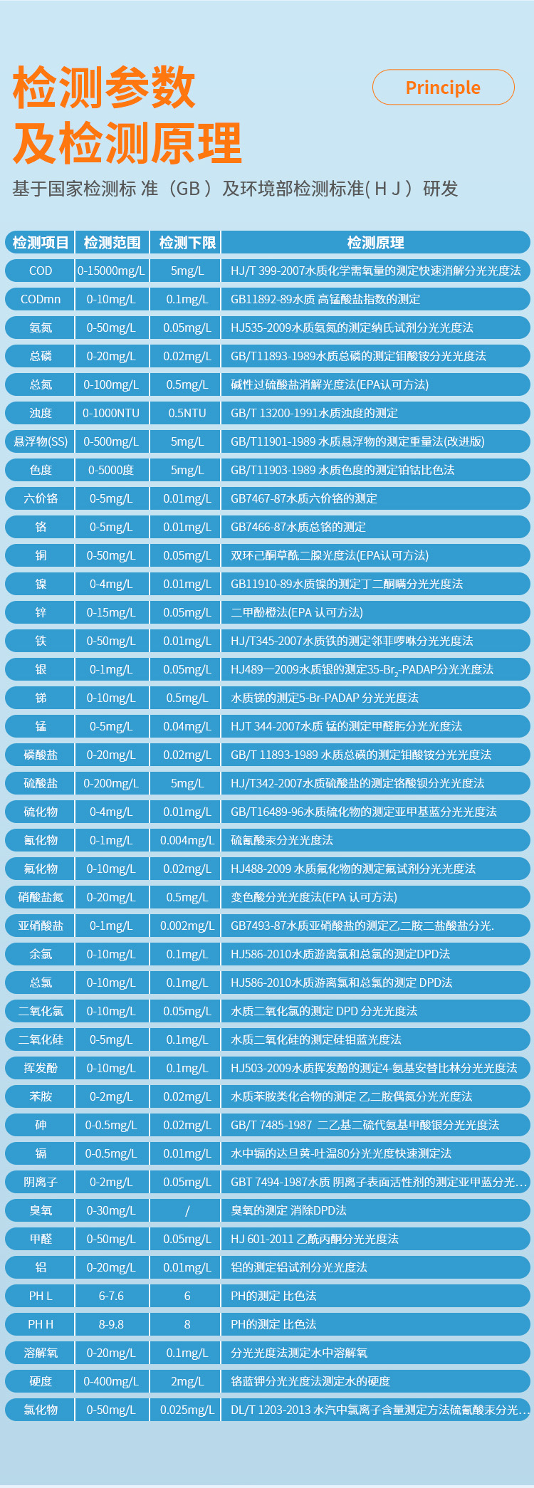便攜COD氨氮總磷總氮濁度檢測儀基于權(quán)威認(rèn)證方法——HJ/T399-2007《水質(zhì) 化學(xué)需氧量的測定 快速消解分光光度法》、HJ535-2009《水質(zhì) 氨氮的測定 納氏試劑分光光度法》、GB11893《水質(zhì) 總磷的測定 鉬酸銨分光光度法》、美國EPA認(rèn)證方法—《變色酸法》和GB13200-91《水質(zhì) 濁度的測定》標(biāo)準(zhǔn)研發(fā)設(shè)計,通過進(jìn)口冷光源、窄帶干涉技術(shù),以分光光度法檢測樣品在特定光源波長下的吸光度,再經(jīng)過微電腦自動處理數(shù)據(jù)后,直接顯示出樣品濃度值,以單位mg/L或度表示。