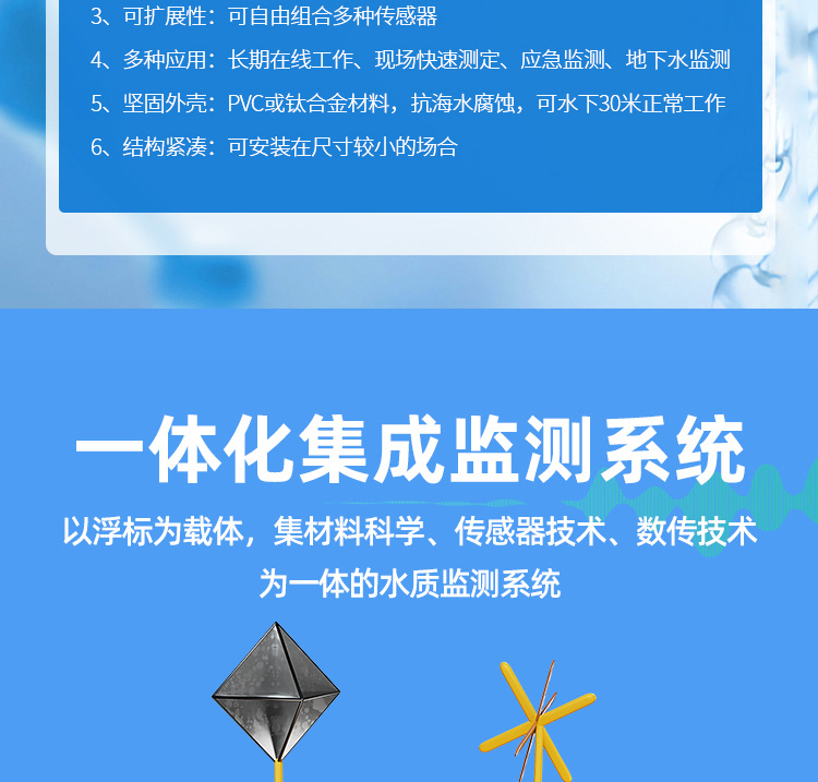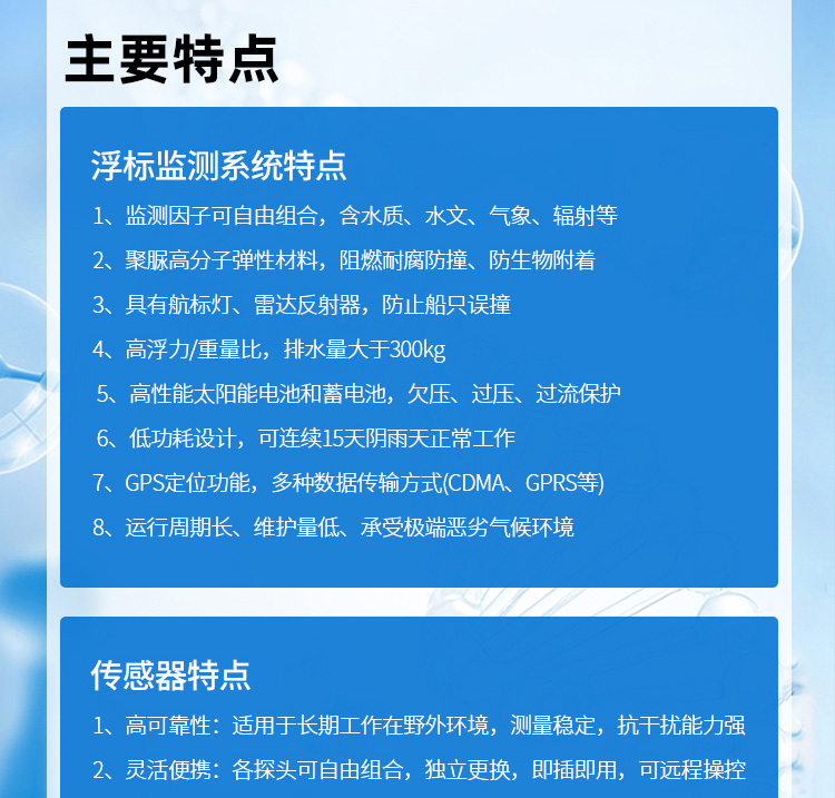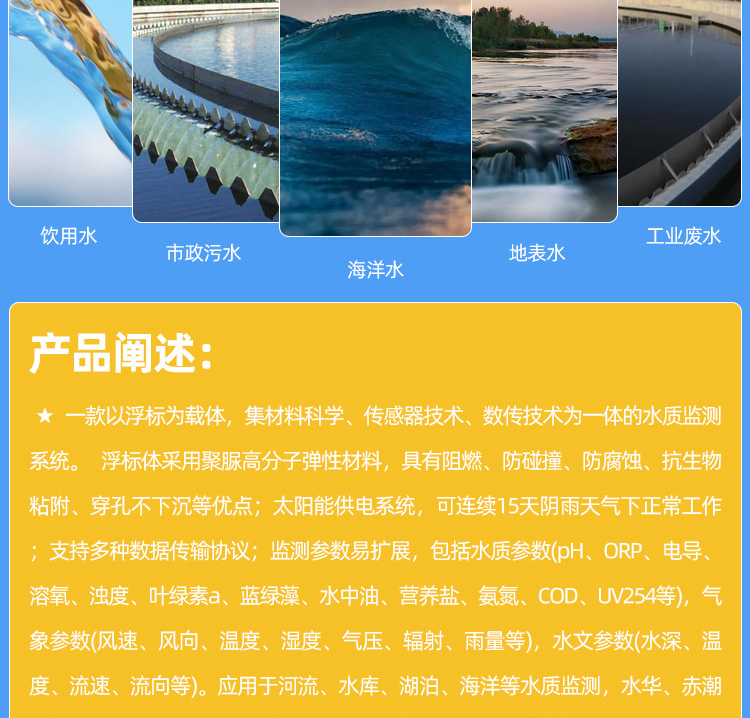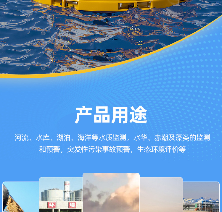浮標體采用聚脲高分子彈性材料,具有阻燃、防碰撞、防腐蝕、抗生物粘附、穿孔不下沉等優(yōu)點;太陽能供電系統(tǒng),可連續(xù)15天陰雨天氣下正常工作;支持多種數(shù)據(jù)傳輸協(xié)議;監(jiān)測參數(shù)易擴展,包括水質(zhì)參數(shù)(pH、ORP、電導(dǎo)、溶氧、濁度、葉綠素a、藍綠藻、水中油、營養(yǎng)鹽、氨氮、COD、UV254等),氣象參數(shù)(風(fēng)速、風(fēng)向、溫度、濕度、氣壓、輻射、雨量等),水文參數(shù)(水深、溫度、流速、流向等)。應(yīng)用于河流、水庫、湖泊、海洋等水質(zhì)監(jiān)測,水華、赤潮及藻類的監(jiān)測和預(yù)警,突發(fā)性污染事故預(yù)警,生態(tài)環(huán)境評價等。